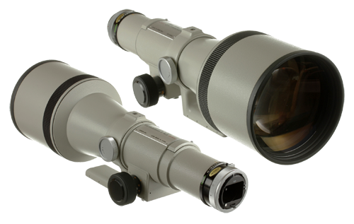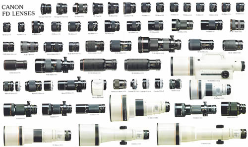 Canon serie FD. A la izquierda primera versión (1971, Chrome nose). Los dos objetivos del centro de la imagen pertenecen a la segunda versión en sus variantes SC y SSC (1973-1976). En la variante S.C. La letra A puede ser también un O al igual que en la primera versión. A la derecha un objetivo de la tercera versión (1976), conocida como New FD. Los super-teleobjetivos presentan el típico color crema de Canon. | |||||||||||||||