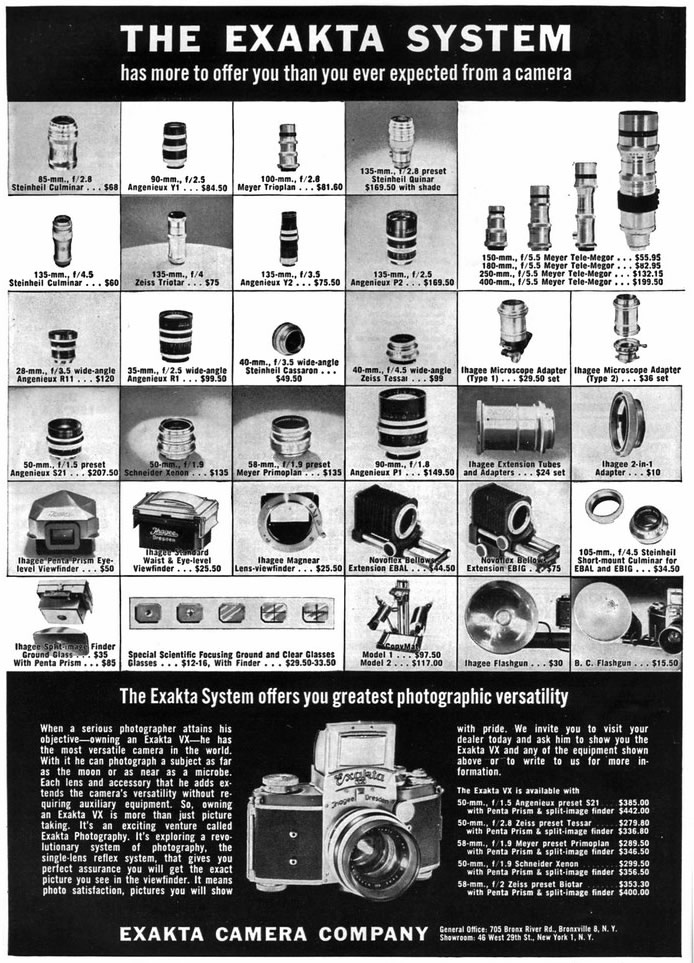 | La Exakta fue concebida como un sistema de cámaras, una amplia gama de objetivos y multiples accesorios: visores intercambiables (uno con fotómetro de Selenio, tubos de extnsión y fuelles para macrofotografía, flash, pantallas especiales para tareas científicas o adaptadores para microscopios, entre otros. | ||
