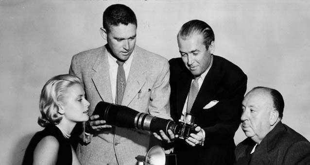| El fotógrafo Phil Bath asesora a Alfred Hitchcock y sus actores acerca del equipo fotográfico que debería llevar el personaje de James Stewart en la pelicula "La ventana insdiscreta, 1954)", que representa a un fotógrafo deportivo. La cámara es una Exakta Varex VX, precursora de nuestra Varex IIa. De izquierda a derecha: Grace Kelly, el fotógrafo de Los Angeles Times Phil Bath, James Stewart y el director Alfred Hitchcock. | ||
