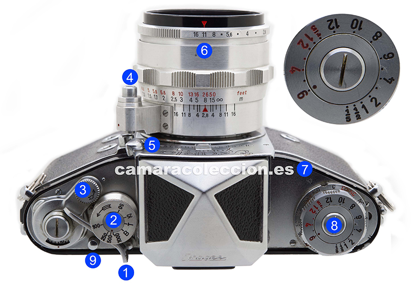 Tomar imágenes con una Exakta es sencillo, manejarla con soltura necesita de un tiempo de entrenamiento, sobre todo si no está acostumbrado a las cámaras analógicas de enfoque manual. Lo primero que vamos a hacer es observar detenidamente los mandos que hay en la parte superior de la cámara (Figura 2). Estos controles nos permitirán el manejo básico de la misma. Lo primero que llama la atención es que la Exakta tiene la palanca de avance de la película (1) y el disparador (4) a la izquierda del cuerpo !!! y no a la derecha como en el resto de cámaras conocidas. ÉSTA ES UNA CÁMARA PARA ENFOCAR CON LA MANO DERECHA Y DISPARAR CON LA IZQUIERDA. Los fotógrafos zurdos estaban de enhorabuena con esta cámara, ya que las operaciones básicas se realizaban con la mano izquierda. Lo cierto que no hemos sido capaces de encontrar la explicación del fabricante a tal diseño. Hemos leido de todo: "desde que el diseñador era zurdo y por eso fabricó así la cámara hasta que fue diseñada al margen del mundo y optaron por ese diseño porque...era una forma de hacerlo". Peter Longden (Ihagee, the men and the cameras) no dice nada al respecto pero recordemos que Steenbergen había trabajado en Ernemann A.G. que producía cámaras con disparador a la derecha y que todos conocían los modelos de cámaras de la época. Lo que si sabemos es que Ihagee quería era producir algo diferente. Parace que el argumento más sólido es el que ofrece Wrotniak, cuando indica que se dió preferencia al enfoque con la mano derecha porque se suponía que era más eficaz (para los diestros) que hacerlo con la mano izquierda. Este argumento coincide con el enfoque de sistema que se le dió a la cámara, donde los accesorios para macrofotografía tenía una gran peso. Este hecho coincide además con la hipótesis de un amigo biólogo de Steenbergen, Dr. Werner Faasch, le sugirió la construcción de la cámara porque necesitaba una buena herramienta para fotografiar insectos, muy dificiles de enfocar con las cámaras de la época. De hecho, enfocar el objetivo de la Exakta con la mano izquierda (como se haría en la mayoría las cámaras) es complicado porque nuestra mano toca permanentemente con el acoplador del disparador que lleva el propio objetivo. IMPORTANTE: LA PALANCA DE AVANCE DE LA PELÍCULA (1) ES DE CASI 180º Y DEBE SER EMPUJADA HASTA QUE TOQUE AL DIAL DE VELOCIDADES POR LA PARTE QUE MIRA AL OBJETIVO. En este dial, las velocidades disponibles van desde 1/50s hasta 1/1000s, además de los modos B y T. Para cambiar la velocidad de obturación, tire del dial hacia arriba y girelo en el sentido de la flecha que aparace grabada en el dial (en contra de las agujas del reloj). Si necesita disparar con velocidades más lentas, dispone de un segundo dial en la parte derecha de la cámara. Este dial tiene dos discos. El inferior (7) es un recordatorio de la película que llevamos cargada. Esta cámara no tiene fotómetro, así que el día solo sirve como recordatorio. Este recordatorio contiene números que corresponden a la sensibilidad de la película en formato ASA. Girelo a la izquierda y ajustelo al triangulito que aparece junto al número 7 de la imagen. En este disco también aparece las letras C: diapositiva color para luz de día, C: diapositiva color para luz artificial, CN: negativo luz de día, CN: negativo para luz artificial. |