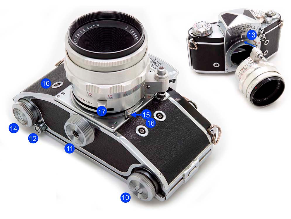 | Figura 3. Izquierda. Sección inferior. 10: Rueda para apertura de la puerta trasera, 11: Rosca para trípode, 12: Rueda para liberación de la cuhilla de corte de la película (se explica más abajo), 14: rosca para encaje del carrete (tirar hacia abajo para encajar el carrete). Sección frontal. 15: Palanca para liberación del objetivo. la cámara disponde de tres conexiones para flash (16), que están señaladas con las letras F, X y M en la cámara. Conexión F para bombillas pequeñas con ilumnación de corta duración, conexión X para cualquier bombilla con una duración de destello de 1/5 de segundo o más larga y conexión M para bombillas grandes de larga duración de destello. Si va a utilizar un flash con esta cámara, es recomendable leer el manual para conocer las velocidades de obturación que debe utilizar y la conexión de flash que debe utilizar para cada marca comercial de bombillas. 17: palanca de apertura manual del diafragma. Derecha: Punto de inserción del objetivo en el cuerpo de la cámara. 13: Botón de liberación del visor. | ||