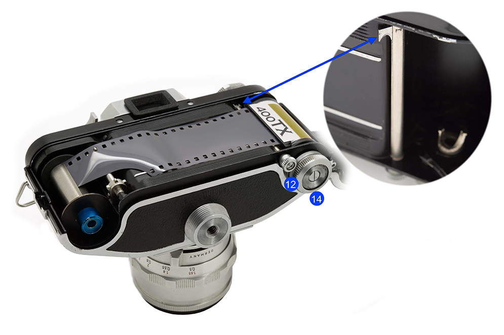 | Figura 4. Carrete instalado en la cámara. Se observa el detalle de la cuchilla introducida por Ihagee para cortar la película en caso de necesidad de cambio urgente de carrete sin haber terminado el que estaba instalado. | ||