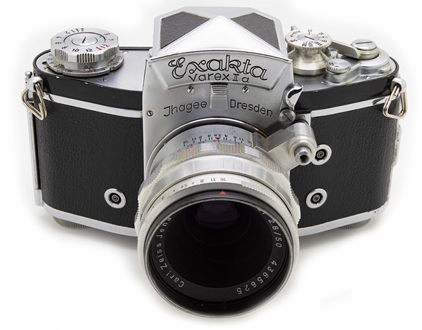| Figura 1. Exakta Varex IIa (serial: 857702), versión 5.1.2 El objetivo que monta es un Carl Zeiss Jena (Alemania del Este) 50mm f/2.8. | ||