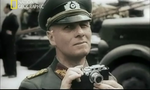 | En el capítulo 3º (El Estallido), aparecen unas imágenes del famoso mariscal de campo Erwin Rommel, apodado el zorro del desierto por su habilidad y triunfos con el Afrika Korps. En la imagen de la izquierda, Rommel toma fotografías con su Leica III. La Leica III fue introducida en 1933. Sus actualizaciones fueron apareciendo hasta 1960, fecha en que dejó de fabricarse el último modelo de la saga, la Leica IIIg. Es muy dificil conocer el modelo exacto de Rommel a través de esta imágenes, ya que la gama III de Leica es muy similar exteriormente. No obstante, considerando que estas imágenes fueron tomadas en 1941, las posibilidades se reducen al periodo IIIa-IIId,... algo es algo.