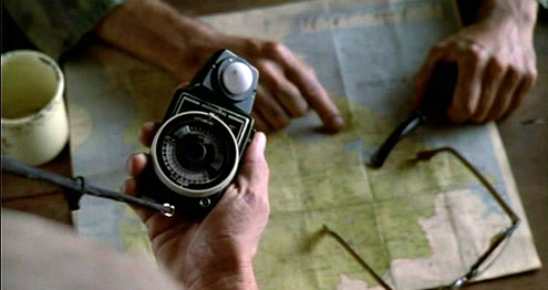 Nick Nolte hace uso un equipo fotográfico típico de reportero de guerra de la época: cámaras mecánicas, acabado en negro para evitar reflejos, una pequeña Leica M y un fotómetro de mano. Para darle realismo al tema, el equipo de Nolte está machacado por el uso. Es los que los anglosajones llaman "Well used". Los reporteros que se observan en algunas escenas van igualmente provistos de equipos profesionales de la época. Nolte utiliza tres cuerpos Nikon: una Nikon F Photomic FTN, una Nikon F2 con visor estándar, y otra Nikon F2 Photomic con motor MD-2. También utiliza una Leica M4P, el único modelo de la firma alemana fabricado en Canadá. |