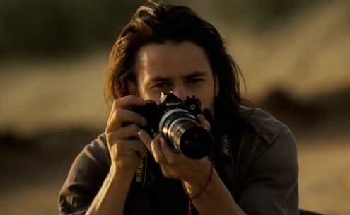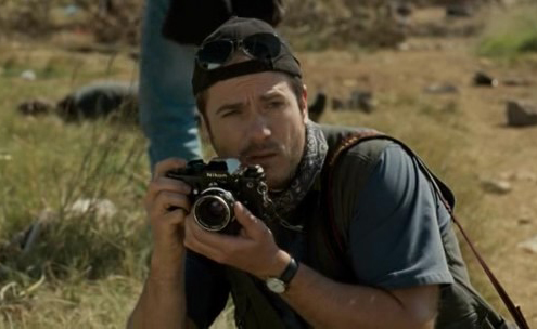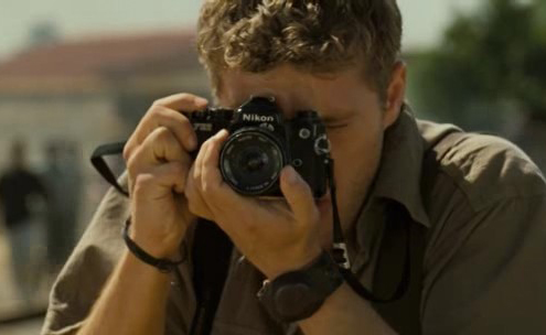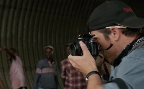 El que también lleva una Nikon FM y FM2 es Taylor Kistch en su papel de Kevin Carter. A la izquierda lo vemos con una Nikon FM y a la derecha con una Nikon FM2 a la que le falta la palanca de rebobinado de la película. Un fallo de atrezzo que pasa desapercibido fácilmente. No obstante, Kistch lleva también una Leica M3, una cámara muy utilizada por los fotógrafos de guerra de los 60, 70 y 80. |