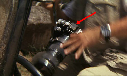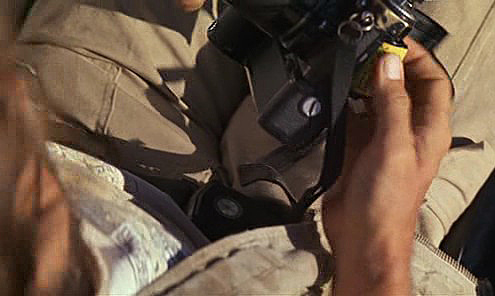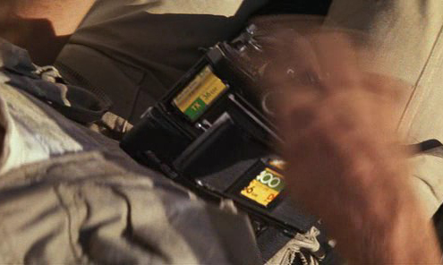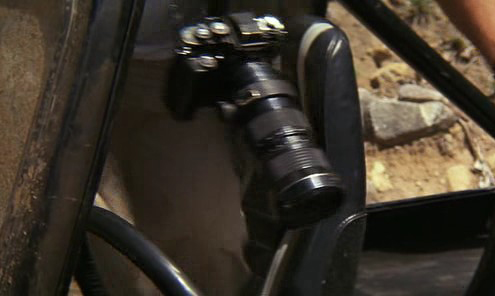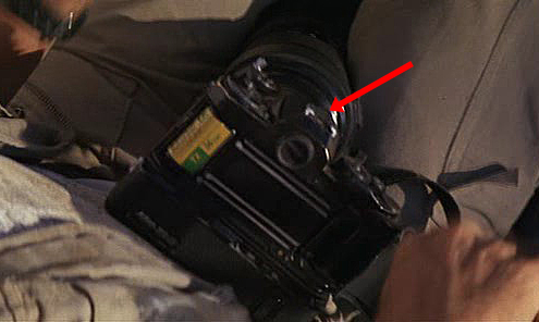 | Pero la anécdota principal de la película es otra. El fotógrafo Bob Tanner es descubierto por el cartel de la droga y tiene que marcharse rápidamente en su Jeep. Observe las imágenes con flechas de color rojo. Arriba a la izquierda, Bob entra en su coche y podemos observar la Nikon F3 con el zoom Nikkor 50-300mm. El visor de esta cámara no tiene zapata para flash, ya que ésta se localiza bajo la palanca de rebobinado de la película. Sin embargo, el siguiente fotograma (arriba a la derecha) muestra una cámara diferente. Observando el anillo bajo la palanca de rebobinado (selector de sensibilidad ASA) podemos pensar que se trata de una Nikon FE2. Esta cámara si muestra la zapata de flash estándar sobre el visor. The motor es un MD-12 diseñado especialmente para la serie Nikon FM/FE. |
