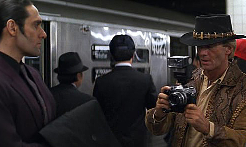| Otra secuencia de la película. Mick Dundee intenta escapar de un miembro del cartel. En la imagen, se dispone a tomar una fotografía con una Nikon FE, objetivo no AI y un flash dedicado (no Nikon). | ![]() |