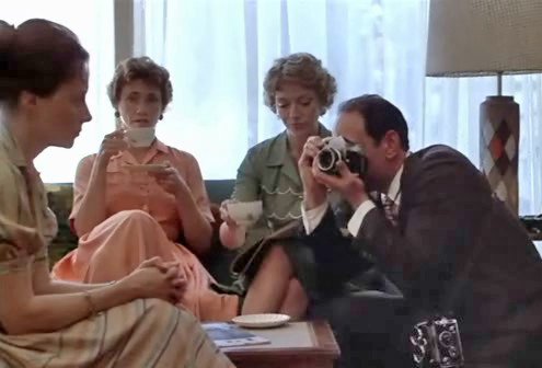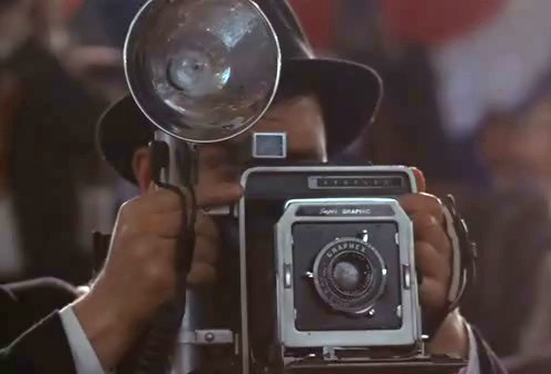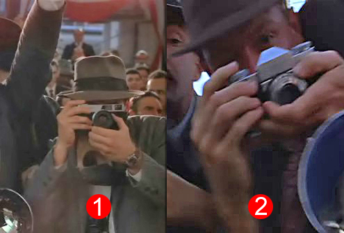 No podía faltar una Nikon F (1959) en una película épica como esta. En cualquier caso, la reina de las reflex profesionales de la época se observa levemente en una de las escenas de la película (izquierda). La imagen superior derecha muestra dos cámaras de muy buena calidad pero impropias de los fotógrafos profesionales de la época. Son los típicos modelos que se insertan en las películas para rellenar las escenas. La cámara 1 es una Canon Canonet. La Canonet comenzó a venderse en 1961 y fue una gama de cámaras compactas telemétricas muy exitosa, tanto que sus diferentes modelos se mantuvieron en producción hasta principios de los 80. Las Canonet suelen llevar objetivos muy luminosos, de entre 40 y 45mm y aunque se trata de modelos destinados al público amateur, son cámaras muy robustas. De hecho, todavía se pueden encontrar cámaras de esta línea en manos de los grandes aficionados a la fotografía. La cámara 2 es una Zeiss Ikon Contarex (1953-1958). Esta reflex dispone de un objetivo fijo Zeiss Ikon Tessar 45mm f/2.8 y fue una de las primeras cámaras que produjo Zeiss después de la II guerra mundial. Recordemos que las factorías de Zeiss cayeron en zona soviética y su maquinaria fue llevada a la URSS como compensación por los daños causados. Más información en la historia de Zeiss/Contax. |