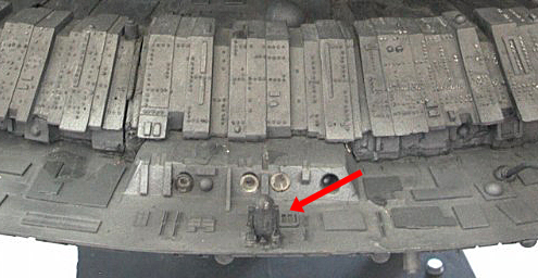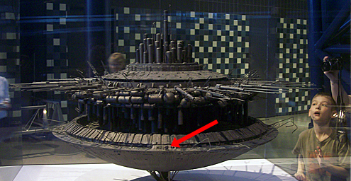 La imagen superior derecha corresponde a la escena en la que esta nave nodriza aparece por primera vez. La flecha roja señala un elemento de la nave que podría ser un dispositivo de vuelo o comunicaciones, pero en realidad se trata de ...una pequeña figura del robot R2-D2 de la Guerra de las Galaxias, cabeza abajo. Resulta que la nave fue diseñada por Ralph McQuarrie, inspirándose en una refinería de petróleo que Speilberg vió una noche en la India. McQuarrie es el mismo personaje que diseña las naves y alienígenas para la saga Star Wars de Geoge Lucas. Posteriormente, la nave fue construida por Gregory (Greg) Jein. Los modelistas de naves espaciales utilizan frecuentemente una técnica denominada Kitbashing que consiste en utilizar piezas sueltas de maquetas de coches, trenes, vehículos militares, aviones, etc. para detallar la parte externa de las naves espaciales. En ocasiones se introducen piezas a titulo de broma y en esta ocasión, el supervisor de efectos especiales Dennis Muren, que había trabajado en Star Wars, hizo un guiño a la saga galáctica introduciéndo una pequeña figura del robot R2-D2, que al menos a nosotros siempre nos pasó desapercibida hasta que leimos la historia en wikipedia. Si alguien tiene la suerte de ir a Washington D.C. puede visitar el Smithsonian National Air and Space Museum donde se exhibe esta maqueta. |