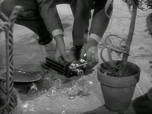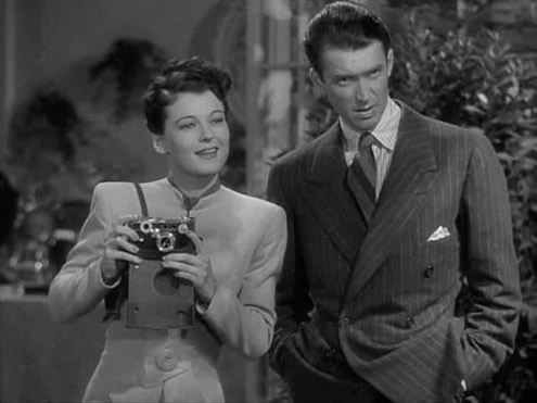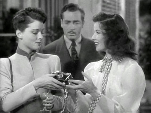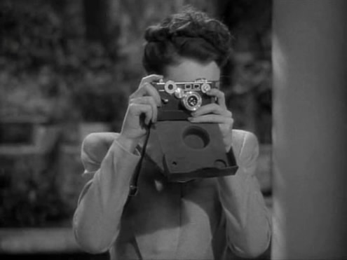 Como fotógrafa de la revista Espía, Elizabeth Imbrie (Ruth Hussey), utiliza una "cámara muy femenina" para el perfil de la época: Una ARGUS C3 tipo I, fabricada entre 1939 y 1957. Las cámaras Argus eran cámaras de bajo coste fabricadas por la compañía Argus en Ann Arbor, Michigan (EEUU). Los modelos Argus fueron muy vendidos hasta finales de los años 60. Debido a su forma, estas cámaras fueron apodadas "el ladrillo" (the brick). Los modelos y año de fabricación de estas cámaras se pueden consultar en la web del Argus Collector Group. En las imágenes inferiores. Abajo izquierda: Katherine Hepburn golpea "accidentalmente" la cámara. La cámara cae al suelo, la puerta trasera se abre y el carrete se vela. Idéntica escena podemos observar en el remake "Alta Sociedad" de 1956. Abajo a la derecha, un modelo Argus C3, aunque algo más moderno que el exhibido en esta película. |
