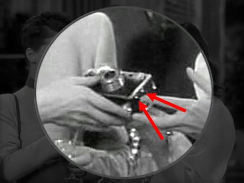 Ahora solo queda ver la película y detenerse en cada escena donde se muestre la parte de la cámara que nos interesa. ¡Empezamos mal!, la señorita Imbrie, la fotógrafa, siempre lleva la cámara en su funda de piel, que cubre completamente el lateral izquierdo. De pronto, (en la imagen inferior izquierda) la cámara aparece sin su habitual funda. Era necesario para la escena que le sigue. Finalmente, hemos tenido suerte. Podemos observar las dos clavijas para conexión con flash (imagen inferior derecha: dos flechas rojas señalan los contactos). Por fin sabemos que utilizaron una Argus C3. Teniendo la fecha de producción de la película, debe tratarse del primer modelo de C3. |