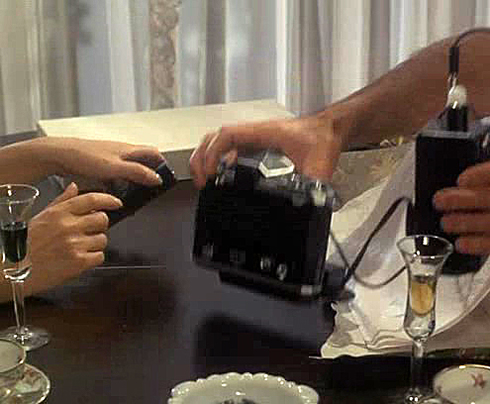 Desde Nueva York, Devereaux viaja hasta La Habana, donde se encuentra con su amante, la hermosa morena Juanita de Córdoba (Karin Dor). Como Devereaux es un romántico empedernido, le trae dos regalos: un contador geiger y esta estupenda Nikon F motorizada. La cámara lleva un motor F-36, pero en vez de llevar un portapilas original Nikon, se le ha acoplado un Remopak. El portapilas original de la Nikon F era un paquete que llevaba ocho pilas tipo LR-14 y se conectaba al motor mediante un cable. Este sistema era bastante engorroso, de forma que el americano Irving Jacobson diseñó y fabricó en 1963 un portapilas que se acoplaba a la parte inferior del motor F-36. Este primer portapilas recibió el nombre de Powercon. Después, dos fotógrafos de la revista LIFE, Laurence Schiller y J.R. Eyrman tomaron el diseño de Jacobson y fabricaron un nuevo portapilas, denominado Remopak. Lo más curioso de esta historia es que Nikon copió el diseño de los americanos y fabricó, en 1968, el portapilas que se muestra en la sección dedicada al motor F-36. Un Remopak como este aparece en la película Los Puentes de Madison. El Remopak que se muestra en esta película lleva un mando a distancia con cables, que no es de la marca Nikon. En la imagen superio derecha se observa con se enciende la una lámpara cuando se dispara la cámara. Desconocemos que tipo de aparato es éste y si realmente sirve para activar cámaras fotográficas. En las películas se pueden montar aparatos que no son reales. Si alguién sabe algo de este mando, le quedariamosmuy agradecidos por la información. |