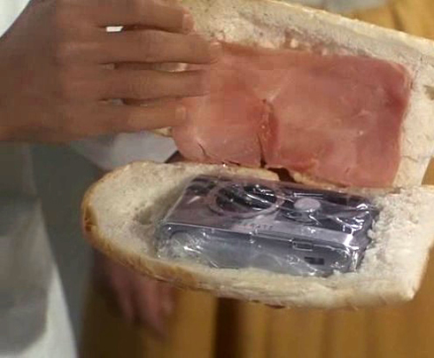 A la izquierda un detalle curioso de la película. Tanto la cámara como el objetivo son introducidos en sendos bocadillos de jamón cocido. |