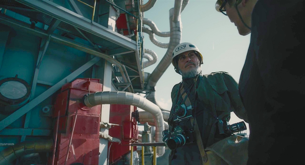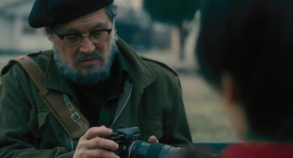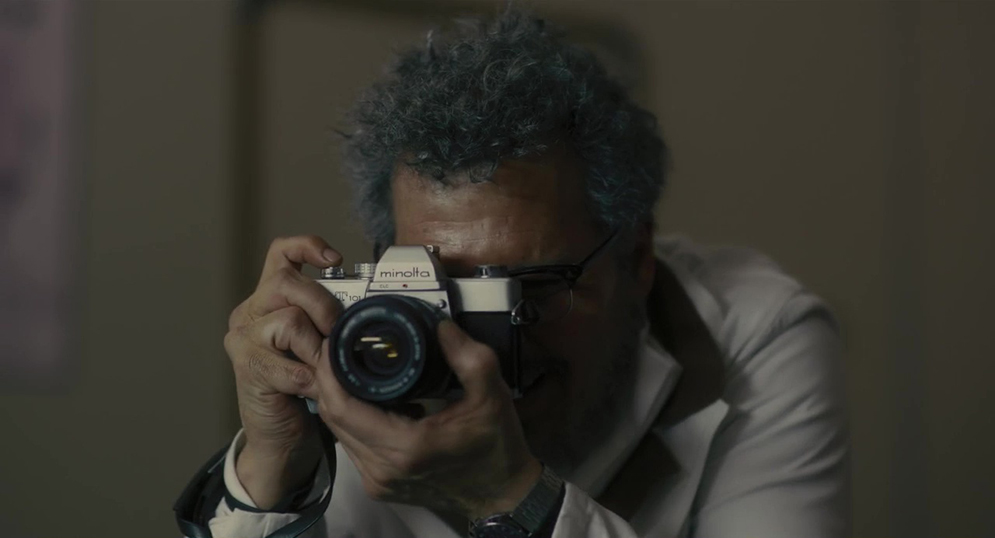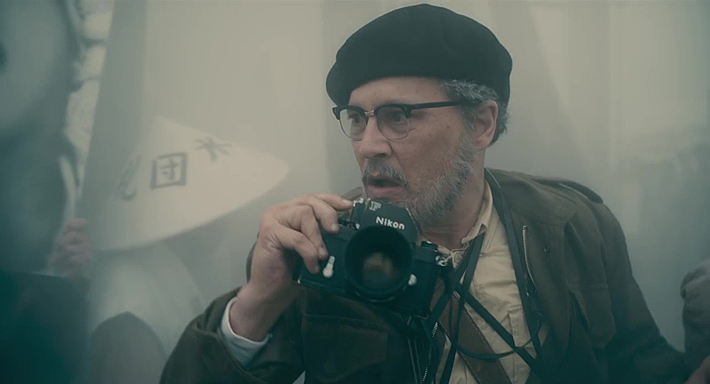 | Auí vemos a Johnny Deep cargado de cámaras como los reporteros de la época. Eugene Smith utilizó un equipo fotográfico muy variado que iba desde cámaras telemétricas como la Leica M3, Olympus Pen o la Olympus Pen F a las réflex Minolta, Canon, Nikon F y otros modelos. En la imagen lleva las dos Minoltas SRT-101 y una Nikon F colgada del cuello. |