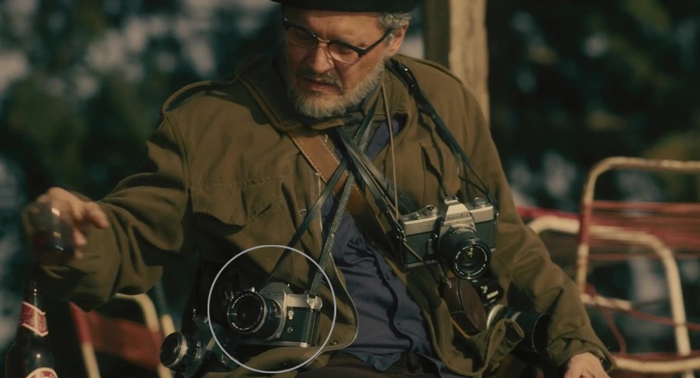 | En esta escena, la cámara señalada con un circulo es una Canon FT QL, que salió a la venta en marzo de 1966. Este modelo tenía un espejo réflex de retorno rápido normal (que podía bloquearse en la posición superior) y ofrecía medición TTL. La cámara presentaba la montura FL y, por lo tanto, podía usarse con lentes con montura FL y montura FD. |