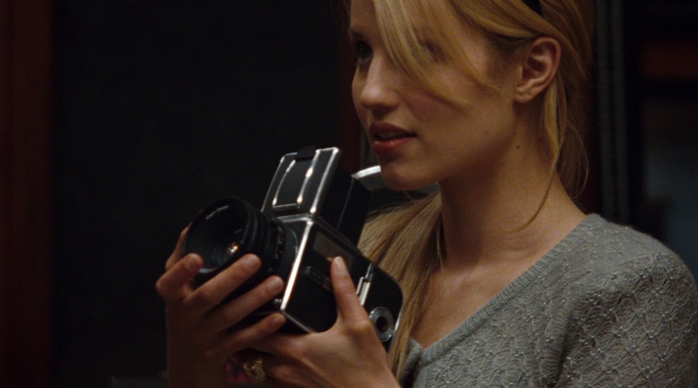 | En la película, Sara comenta que tiene que hacer fotos para pagarse los carretes. Tiene que ganar bastante dinero, porque entre su colección de cámaras encontramos esta Hasselblad 500 C/M de 1991 que es nada menos que el modelo 50th Anniversary, conmemorativo de los 50 años de existencia de la marca sueca (1941-1991). La plaquita metálica que toca la actriz con el dedo pulgar de su mano izquierda lleva grabafa la inscripción 50th aniversario. | ||