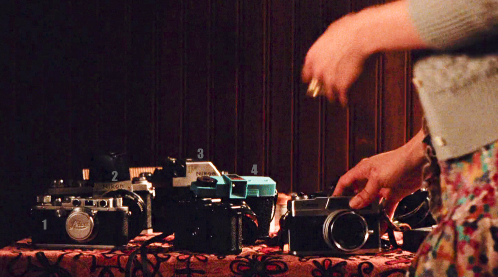 | Sara decide regalarle una cámara a Smith y elige su preferida Cannonet de entre su colección. Sobre la mesa se disnguen al menos cuatro cámaras más. La número 1 es una Leica III. De este modelo hub varias versiones muy similares que se fabricaron entre 1933 y 1951) hasta el modelo C. Leica es la marca que introdujo la película de 35mm en una cámara y son mundialmente famosas por su precisión, calidad de imagen, robustez y precio!!! Todos los grandes fotógrafos y los ricos caprichosos han utilizado o utilizan cámaras Leica. La número 2 es una Nikon F con visor de acción (action finder). La número 3 es otra Nikon con F Photomic de 1962 y la número 4 es la famosa Diana F. No es posile ver si se trata del modelo original de 1957 o la Diana F+ que fabrica la empresa Lomography desde 2007. | ||