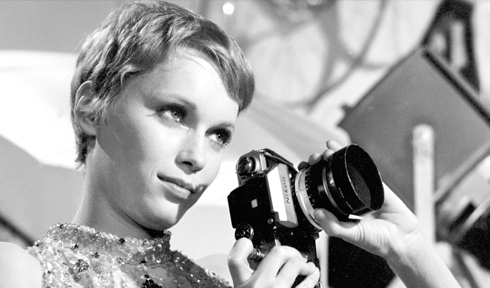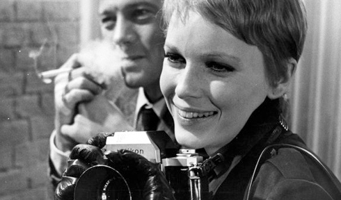 | La joven y atractiva Mia Farrow, que contaba entonces con 23 años de edad, interpreta a la alocada Caroline que porta frecuentemente una Nikon F Photomic T. Este modelo de 1965 fue el primero en incorporar un fotómetro TTL. Las Nikon F son cámaras modulares con visor intercambiable. El visor Photomic T se vendía también como accesorio independiente, pero los ingenieros de Nikon no pudieron evitar que este visor fuera más grande que los anteriores, de forma que el cuerpo de las cámaras Nikon F, anteriores a 1965, tenía que ser modificado para poder adaptar este visor. Durante unos años, Nikon siguió vendiendo cuerpos antiguos que tenían que ser modificados y otros de nuevo diseño, que no necesitaban modificación alguna. Los cuerpos modificados de fábrica eran marcados con un punto rojo delante del número de serie. Esos cuerpos, conocidos como "red dot" son actualmente una de las piezas más buscadas por los coleccionistas de cámaras. En la sección dedicada a esta cámara dispone de más información sobre el funcionamiento de la misma y de las modificaciones red dot. |