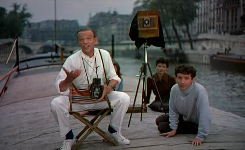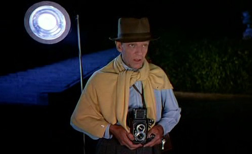 | Aunque la mayor parte de las fotografías las realiza con una cámara de placas, Asteire llega a mostrar hasta tres Rolleiflex colgando de su cuello, y habituaalmente lleva al menos una de ellas. Ha sido imposible determinar con exactitud el/los modelos de Rollei que muestra en la película, ya que la resolución de la imagen y la proximidad de la cámara impiden una identificación correcta de modelos que guardan cierto parecido. Posiblemente un experto en esta marca nos podría indicar modelos exactos. No obstante, la cámara que se muestra en la imagen inferior derecha es con bastante probabilidad una Rolleiflex Automat modelo K4B fabricada entre 1954 y 1956. Pero en las otras imágenes se muestran otros modelos. A todas estas cámaras se les extrajo la placa que muestra la marca Rolleiflex. | |