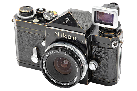 | La imagen de la izquierda muestra la parte trasera del Nikkor-O 2.1cm f/4. Todo el cilindro negro de la parte posterior del objetivo penetra en el cuerpo de la cámara, hasta quedar muy cerca del obturador. Por ello es necesario mantener levantado el espejo de la cámara. Como el espejo queda levantado, no se puede mirar por el visor de la cámara (se ve todo negro). Por ello, en su época, el objetivo se vendía con un visor específico que se acoplaba en la zapata para flash de la Nikon F. La imagen de la derecha muestra una Nikon F con el Nikkor 2.1cm y el visor suministrado para este gran angular. Imágenes obtenidas de Destoutz. | |