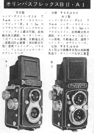 El embrollo Flex Según Olympus y la mayor parte de las fuentes consultadas, el primer modelo Olympus Flex salió al mercado en 1952. Un año más tarde, Olympus actualizó este modelo Flex añadiendo algunas mejoras. La Olympus Flex era una cámara cara y por ello, la compañía sacó al mercado la Olympus Flex A en 1954. Se trata de un modelo de menos prestaciones y precio más económico, que monta con un objetivo Zuiko 75mm f/3.5. Para distinguir claramente el modelo caro del barato, se decidió renombrar la segunda versión de Olympus Flex y llamarla Olympus B II, porque este modelo se seguiría fabricando paralelamente al modelo A. En 1955 vería la luz el modelo A2.8 y entonces al primer modelo A se le cambió el nombre por el A I. Finalmente, en 1956 se producíría el denominado Olympus Flex A3.5 II. La clasificación de los modelos A parece estar clara para todas la fuentes consultadas. Sin embargo, el desarrollo de los primeros modelos B es algo caótico. Parte de esta confución se debe a que se trata de cámaras escasas, y que por lo tanto no resulta fácil de inspeccionar directamente; y a que las cámaras no portan los distintivos del modelo. Así, hay coleccionistas que distinguen la Olympus Flex B I y B II, que corresponderían respectivamente a las cámaras producidas en 1952 y la producidas entre 1953-55. Según la guía McKeown's (McKeown´s Price guide to antique & classic cameras), ambos modelos B montaban un objetivo Zuiko 75mm f/2.8, pero el obturador de la Olympus Flex B I alcanzaba 1/400s, mientras que el de la B II llegaba hasta 1/500s. Incluso, en camerapedia se pone en duda la existencia del modelo B I, argumentando que el fabricante nunca se ha referido a dicho modelo. Ciertamente Olympus no habla de B I pero si del modelo tipo I y B II. Encontramos tlr-cameras.com, donde traducen un artículo escrito por E. Suzuki en la web del Olympus Photo Club of Japan. Suzuki, que además de coleccionista es investigador, tuvo acceso a los archivos de Olympus y consigue relatar la cronología de todos los modelos Olympus Flex. La Olympus Flex era una copia de la alemana RolleiFlex, la cámara top line de la época en el segmento del medio formato. Los alemanes estaban cansados de que los copiaran en Japón e interponían continuas demandas contra firmas niponas, lo que obligaba a los japoneses a realizar continuamente reformas de sus modelos.