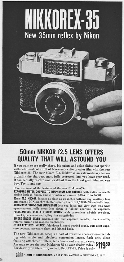 En 1959, Nippon Kogaku (actualmente Nikon Corporation) disponía de dos gamas de cámaras profesionales: la serie S telemétrica y la serie F reflex, cuyo primer modelo, Nikon F, acababa de salir al mercado. Ambas series estaban destinadas al mercado profesional y resultaban excesivamente caras para el mercado de consumo. La Nikkorex 35 lleva un prisma tipo porro en vez del pentaprisma habitual de las cámaras SLR, monta un fotómetro de selenio y obturador central de pétalos, lo que permite la sincronización con flash a cualquier velocidad. Sin embargo, su fiabilidad es reducida, debido en gran medida a la baja calidad de su obturador Citizen MLV, que falla con frecuencia. Con la Nikkorex 35 comenzaron los problemas para Nippon Kogaku. Era además, la primera vez que los componentes de una cámara Nikon eran fabricados por empresas ajenas a Nippon Kogaku, y ésta no estaba nada contenta con las calidades y terminaciones de los productos. Los ingenieros de la Nippon Kogaku hacían continuos viajes para enseñar los métodos de fabricación de componentes a los técnicos de las empresas subcontratadas, pero las mejoras eran muy lentas.