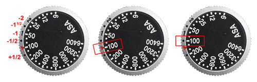 El anillo exterior del dial ASA lleva grabados los valores de compensación en forma de puntos o números. En la imagen de la izquierda hemos insertado los valores de compensación de la exposición desde -2 hasta +1/2. La imagen del centro correspondería a una configuración para ASA 100, sin compensación de exposición. La imagen a la derecha muestra un ejemplo de configuración para ASA 100, utilizando un objetivo Nikkor 8mm f/2.8 con una pantalla de enfoque tipo C. Esta combinación necesita una compensación de -1/2. En la página 39 del manual de la cámara (página 40 del archivo pdf) puede encontrar la tabla completa con todas las combinaciones de pantallas y objetivos de la época. Fuente: cameramanuals.org. |