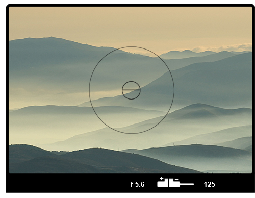 Dando un paso más en la información de pantalla, Nippon Kogaku, añadió una ventana que permite visualizar el diafragma seleccionado, además de la velocidad de obturación, que ya fue incluida en el último modelo F. La exposición correcta se alcanza cuando la agua se coloca entre los signos + y -, como en el ejemplo que se muestra en la imagen de la derecha. Este fotómetro mantiene la medición ponderada al centro. El círculo grande de la pantalla corresponde al área que acumula el 60% de la medición, mientras que el 40% restante se toma del resto de la zona del encuadre. Es recomendable, por tanto, que el objeto a fotografiar se encuentre dentro de ese círculo mayor. El círculo más pequeño es de imagen partida y ayuda al enfoque, en caso de que el fotógrafo tenga dioptrías y no se haya instalado un ocular con corrección óptica. |