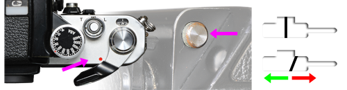 Apriete este botón y observará que la imagen se oscurece pero podrá ver los elementos enfocados, tal como aparecerán en la fotogafía. Para levantar y bloquear el espejo hay que pulsar el botón (1) y desplazar simultáneamente la palanca (2) casi 180º. En esta situación, no podrá ver nada por el visor. Esta herramienta se utiliza para fotografías de exposición muy larga, porque evita el golpe que da el espejo al caer. También es imprescindible para utilizar ciertos objetivos, como el Nikkor 2.1cm f/4, cuya lente posterior se introduce hasta casi tocar con el obturador. Este objetivo lleva su propio visor. Finalmente, con el espejo levantado, los motores de arrastre alcanzan su máxima velocidad. |