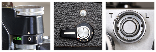 Como en anteriores visores Photomic, el anillo de sensibilidades ASA de la película (9) se ubica a la derecha del visor, sobre el dial de velocidades. La gama de sensibilidades se mantiene en el rango 6-6400 ASA. Para seleccionar la sensibilidad del carrete bastará con tirar hacia arriba del anillo y hacer coincidir el triángulo rojo con la sensibilidad adecuada. La numeración lateral en color negro corresponde a los factores de exposición necesarios con diferentes pantallas de enfoque. Más abajo se detalla el funcionamiento de este dispositivo. El botón disparador (10) tiene tres posiciones y se puede cambiar de una a otra levantando y girando el anillo que lo rodea. La posición L bloquea el disparador. La posición central permite el disparo normal y la T se utiliza para exposiciones de más de 1s. En el extremo del panel frontal se observa la palanca de avance de la película (11). Esta palanca activa el fotómetro, empujándola levemente hacia afuera hasta que se vea visible un punto rojo. El contador de exposiones (12) lleva marcados en rojo las exposiciones de los carretes estándar (12, 24 y 36). |