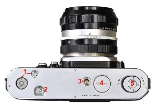 Para comenzar por el principio, debemos ir a la parte inferior de la cámara. Podemos observar los dos contactos para el motor (1). Esta cámara es compatible con los motores MD-1, MD-2 y MD-3. LOs dos primeros son prácticamente idénticos, mientras que el último es más escaso en prestaciones y precio. Junto a estos se localiza el botón de rebobinado (2). Es imprescindible apretar este botón antes de rebobinar la película. En caso contrario, se romperán los bordes agujerados de la misma. En una posición más o menos central se localiza la rosca para trípode (3). El compartimiento de baterías (4) alberga 2 pilas botón de 1.5v tipo LR44 o SR-44. Las primeras son alcalinas y las segundas son de óxido de plata. Son más recomendables estas últimas porque mantienen la tensión constante hasta el final de la vida de la batería, no sueltan líquido y son menos contaminantes. Recuerde: polo positivo hacia afuera. Finalmente, la pestaña de apertura de la puerta trasera (5). Hay que desplegar la pestaña y girar en sentido (o) para abrir o (c) para cerrar. La tapa central tiene una hendidura que permite desenroscar con una moneda. Esta tapa ha de ser extraida para adaptar el motor de arrastre. |