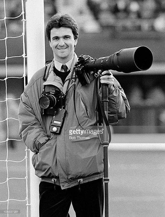 | Bob Thomas, fotógrafo deportivo inglés. La imagen está tomada antes de que comience el partido entre el Coventry City y el Middlesbrough el 1 de Octubre de 1988. La cámara que lleva un teleobjetivo es la Nikon F3P. La otra parece ser una F3HP. | ||