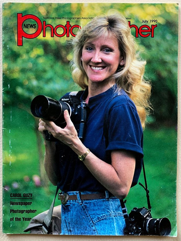 La variante F3P debió llegar a oidos de los fotográfos de todo el mundo, que debieron solicitar que fuera vendida fuera de las fronteras de Japón. De hecho, llegó a ser tan popular entre los profesionales que el modelo estándar era el más raro de encontrar. Brian Long estima que se construyeron no menos de 790000 unidades de Nikon F3 de todos sus modelos, de las que 25000 serían Nikon F3P. Hemos revisado las unidades F3P que se venden en ebay y una de ellas lleva el número de serie P9027892, lo que demuestra que se fabricaron algunas cámaras más. Arriba: Carol Guzzy, portada de la Revista Photographer News. Las dos cámaras que lleva Carol son Nikon F3P. |