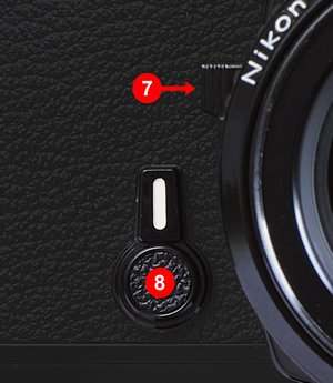 | Figura 3. La parte frontal de la cámara lleva las dos mismas palancas que la Nikon FM. Junto a la montura del objetivo aparece la palanca de previsualización de la profundidad de campo (7). Esta palanca ayuda a visualizar que parte de la imagen quedará enfocada y que parte quedará fuera de foco, según el diafragma que hayamos elegido. Conforme el diafragma sea más cerrado (número f mayor), más oscura se verá la imagen, debido a que veremos la luz que entra realmente con ese diafragma. Visite la sección dedicada a técnicas básicas para conocer cuando interesa un diafragma más abierto o más cerrado. La palanca del disparador retardado (8) presenta dos funciones. Para activar el retardo del disparo habrá que girarla en sentido contrario a las agujas del reloj y después pulsar el disparador de la cámara (...no olvide pasar la película). Si mantenemos presionada esta palanca, en el sentido de las agujas del reloj, conservará la lectura del fotómetro aunque cambiemos el encuadre. Esta función es útil cuando queremos fotografiar una zona con un contraste muy alto, utilizando la lectura de una zona próxima, iluminada homogéneamente. | |||