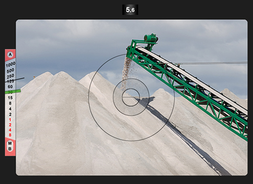 Figura 2. El visor de la cámara dispone de todos los elementos necesarios para el control de la exposición. En la parte superior del visor se muestra el diafragma seleccionado en el objetivo. A la izquierda se muestra la ventana del fotómetro. Hay dos agujas, una verde transparente y otra negra más fina. Cuando la cámara está en modo Auto, la aguja verde se colocará sobre la letra A y la aguja negra marcará la velocidad seleccionada por el procesador de la cámara. En modo Manual, la aguja verde marcará la velocidad seleccionada por nosotros, mientras que la negra señalará la propuesta por el procesador de la cámara. En la imagen de la izquierda, nosotros hemos seleccionado 1/30s, mientras que la cámara nos indica que sería conveniente utilizar una velocidad de 1/125s.