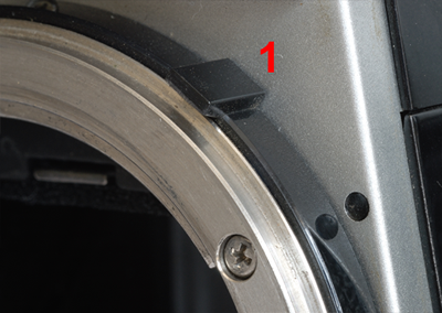 Las imágenes superiores muestran un detalle de la montura de la Nikon FE y FE2. Este último modelo, fabricado en pleno apogeo de los objetivos Nikkor AI ya no puede montar los antiguos Nikkor de los años 60. Observese que la pestaña de reconocimiento del objetivo (1) es movil en la FE, accionada por un pequeño botón (2) situado junto a este bloqueo. En el modelo FE2, la pestaña es fija y el botón de liberación ha desaparecido. Una nueva era comenzaba para las cámaras Nikon. Sin embargo, presenta la ventaja de poder utilizar todos los objetivos Nikkor AF actuales que no sean del tipo G (sin anillo de diafragmas), no porque no puedan montarse sino porque no se puede regular el diafragma. |