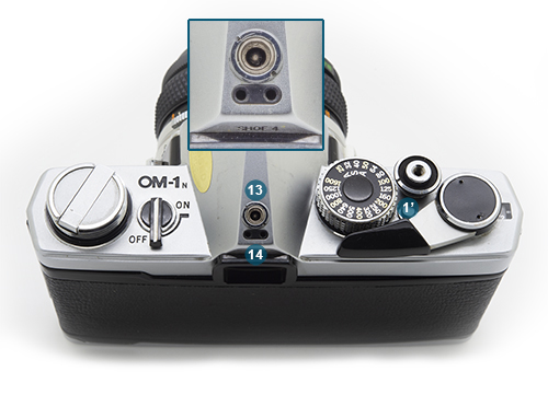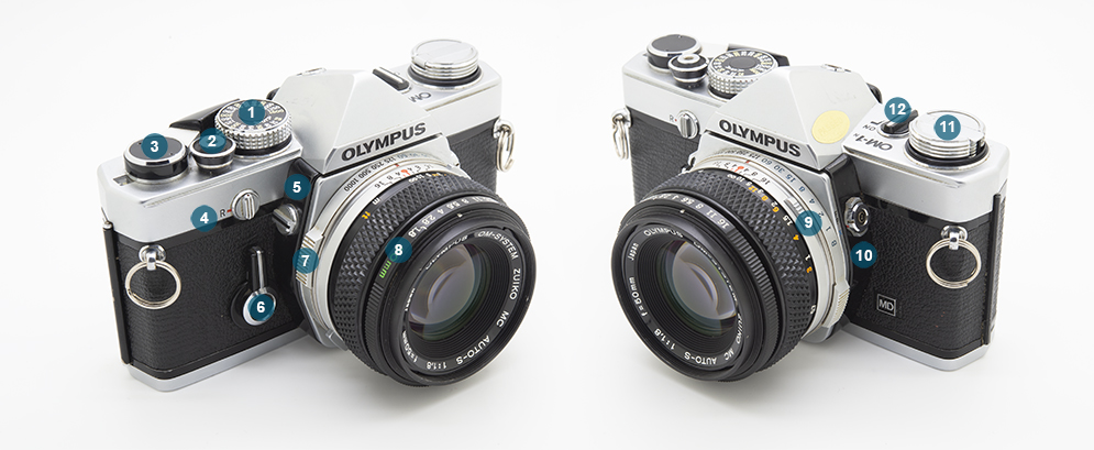 La Olympus OM-1 es una cámara sencilla de manejar, si conoce bien el fundamento de la cámara fotogáfica. La cámara es mecánica así que funciona a cualquier velocidad sin pilas. La pila botón de 1.35v solo alimenta el fotómetro de la cámara. Debido al cambio de posición de elemenos de la cámara, el tradicional dial de selección de velocidades fue sustituido por una rueda para el ajuste de la sensibilidad (ASA) de la película (1). Para girar esta rueda deberá pulsar un botoncito que se encuentra a su derecha (1'). Junto a esta rueda se encuentra el disparador (2) y la palanca de avance de la película (3). El contador de exposiciones se situa a la derecha de esta palanca como es habitual. Cuando se va a rebobinar el carrete debe girar el dial (4) hacia la izquierda, presionando ligeramente con el dedo. Esta Olympus dispone además de un sistema de bloqueo del espejo. Si presiona y pone en posición vertical el dial (5), el espejo permanecerá levantado hasta vuelva a colocar el dial en su posición normal. El sistema de disparo retardado (6) consta de una doble palanca. La grande y visible se puede girar unos 180º para retardar el disparo unos 12 segundos, pero colocándolo en posiciones intermedias se puede ajustar a 4 u 8 segundos. Cuando gira esa palanca, observe que detrás queda otra más pequeña, moviendola hacia la derecha (si miramos la cámara de frente) se activa el disparador. El dial de selección de la velocidad de obturación es un anillo que se encuentra delante de la montura del objetivo. La abrazadera (7) ayuda a elegir una velocidad entre 1s y 1/1000s +B. El anillo de diafragmas se sitúa en la parte frontal del objetivo (8). El botón alargado (9) permite cambiar el objetivo de la cámara y la zapata de contactos (10) la conexión con flahses electrónicos (X) o de alta velocidad (FP), girando el pequeño dial de selección. Si el flash dispone de zapata de conexión estándar, se puede acoplar en un accesorio opcional que se enrosca sobre el prisma de la cámara. La palanca de rebobinado de la película (11) se encuentra en la parte superior izquierda de la cámara (si se la mira desde atrás). Tirando hacia arriba de esta palanca se abre la puerta trasera de la cámara. El dial que enciende y apaga el fotómetro ON-OFF (12) se encuentra junto a la palanca (12).