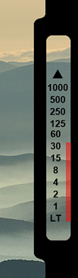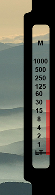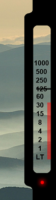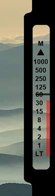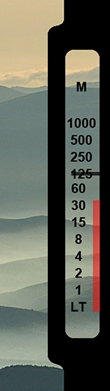 | MODO AUTO. Hemos seleccionado un diafragma cualquiera y la cámara nos muestra la velocidad seleccionada automáticamente. En este ejemplo 1/125s (imagen de la izquierda). Si entra demasiada luz al fotómetro aparecerá la flecha negra apuntando hacia arriba. En ese caso se deberá cerrar el diafragma hasta que aparezca la raya negra marcando alguna velocidad de disparo. MODO FLASH. Cuando se conecta un flash Ricoh speedlight 200, 240 o superior; se activa un diodo rojo cuando el flash está preparado para disparar. La velocidad máxima de sincronización es de 1/125s, que será la velocidad que elija la cámara si colocamos el dial de velocidades en la posición A, si utilizamos un flash automático TTL. En manual podremos elegir cualquier velocidad hasta 1/125s. POSICIÓN B. En esta posición el obturador permanecerá abierto desde que se aprieta el botón disparador hasta que se suelta este botón. Una letra B aparece en la parte superior de la ventana de datos. | MODO MANUAL (M). En la imagen de la izquierda, hemos seleccionado un diafragma cualquiera y hemos rotado el dial de velocidades hasta 125 (1/125s). Esta velocidad es la correcta y por ello solo obervaremos la letra M en la parte superior de la ventana de datos y la raya negra sobre 125. En la imagen siguiente a la derecha vemos que al seleccionar 60 (1/60s) entra demasiada luz al sensor y aparece la flecha negra hacia arriba, indicando sobreexposición. Si hubieramos elegido 250 hubiera aparecido la flecha mirando hacia abajo. La imagen siguiente muestra los signos +/- que indican que se ha seleccionado un valor de compensación de la exposición que no es cero. La última imagen muestra que la raya negra tapa las letras LT (Long Time). Esto significa que hemos elegido una velocidad inferior a 1s (2, 4, 8 o 16s). En esta situación no nos podremos ayudar del fotómetro de la cámara y tendríamos que buscar uno de mano o realizar la toma probando varias velocidades, para asegurar la fotografía. | ||