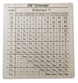 ![]() Los fotómetros Ombrux aún llevan la escala de exposición en segundos, aunque existen diferencias entre las variaciones que aparecieron en el mercado. La otra cuestión importante es que la referencia de sensibilidad de la película no se ofrece en ASA, como actualmente lo hacen todas las cámaras y fotómetros de mano. La escala aparece en DIN o en grados Scheiner. En la web de James Olliger se muestra una tabla con las equivalencias de la escala Scheiner, DIN alemanas, las actuales ASA e ISO, y otros índices. |