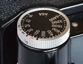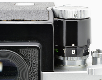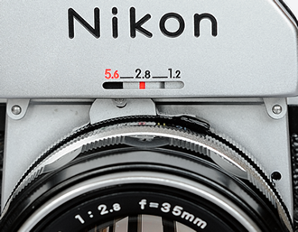 El principal avance de este visor fue el sistema de reconocimiento del diafragma del objetivo en uso (Figura 3a). Este sistema se mantendría en la Nikon F2 hasta 1978. El problema de los Photomic anteriores es que no pueden reconocer el diafragma del objetivo que está colocado en la cámara. Por ello, cada vez que se cambia de objetivo hay que ajustar el fotómetro del visor y esto se hace haciéndo coincidir la sensibilidad de la película con el diafragma más abierto del objetivo en uso (revise la sección Photomic T). Ahora el diafragma más abierto del objetivo es reconocido por el visor desde el momento en que se acopla al cuerpo de la cámara. Para ello basta con realizar dos pasos: inserte el objetivo y abra completamente el diafragma. En ese momento, observaremos que la escala del visor (situado bajo la marca Nikon) marca el diafragma máximo del objetivo (2.8 en este caso). De esta forma, el exposímetro del visor ya sabe cuál es el diafragma más abierto y calcula las nuevas posiciones en función del número de clics que giramos para abrir o cerrar el mismo. Ya no es necesario el sistema de ajuste manual del diafragma, de forma que el dial de sensibilidades (Figura 3b) ya solo presenta la sensibilidad de la película. Para seleccionar la sensibilidad de la película, basta con tirar del anillo cromado hacia arriba y girar hasta enfrentar la sensibilidad de la película en uso con un pequeño triangulo rojo. En el ejemplo que se muestra en la Figura 3b, la cámara ha sido configurada para una sensibilidad de 100 ASA. Finalmente, este nuevo visor dispone del modo B y T (Figura 3c), que los visores anteriores no tenían. En el modo B, el obturador se abre al pulsar el botón de disparo y no se cierra hasta que el disparador de la cámara no suelta. Es muy recomendable utilizar un cable disparador para utilizar esta función. Si coloca el dial en la posición T observará que al pulsar el disparador, el obturador se queda abierto, aunque retire el dedo del disparador. Para cerrar el obturador, gire el dial de velocidades. |