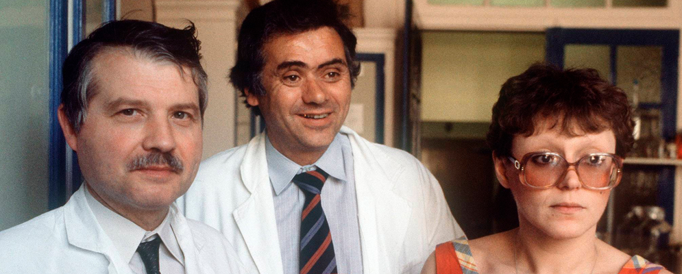 En 1984, los investigadores del Instituto Pasteur Luc Montagnier (izquierda) y Francoise Barré-Sinoussi (derecha)descubren el virus VIH que causa el SIDA. Ambos científicos recibieron el Premio Nobel en 2008. En el centro el colaborador Jean Claude Chermann |
