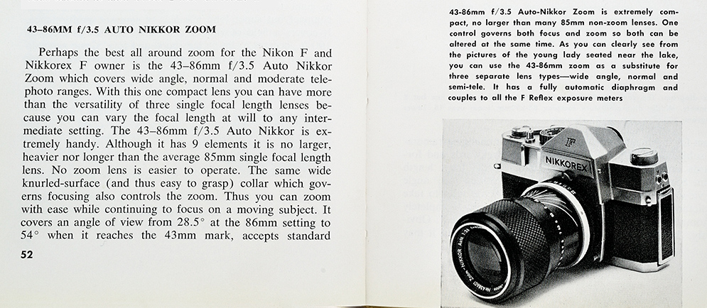 Según Uli Koch, El zoom Nikkor Auto 43-86mm f/3.5 fue presentado, como objetivo intercambiable, en la Covención de Marzo de 1962 de la Master Photo Dealers and Finishers Association (MPDFA, actualmente PMA -Photo Marketing Association-), celebrada en Chicago (USA). El libro "Official Nikon F & Nikkorex F manual", en su primera edición de 1962 (Figura 1), recoge ya el zoom e incluso indica su precio. Estos datos coinciden con la información que aporta la propia web de Nikon Imaging, aunque en ese artículo, parece que nadie tiene claro cuando realmente salió a la venta el zoom como óptica intercambiable. Peter Braczko indica que la Nikkorex zoom 35 (que lleva este objetivo como óptica fija) fue fabricada a partir de febrero de 1963 y que, basándose en la experiencia con esta cámara, el fabricante japonés decidió producir el objetivo como óptica intercambiable. Sin embargo, Brazcko asume la misma fecha de producción (Febrero de 1963) para cámara y objetivo. Finalmente, Richard de Stoutz muestra el primer objetivo fabricado (nº438611) y lo data en 1963. |