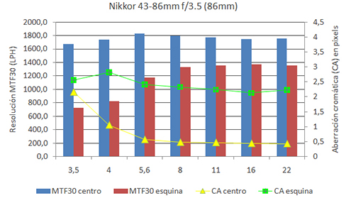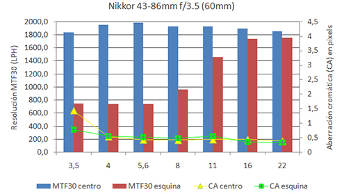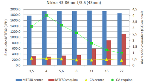 Figura 4. Resultados del análisis MTF del Nikkor Auto 43-46mm f/3.5 | ||