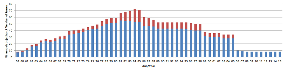 | Figura 1. Evolución cuantitativa de objetivos Nikkor y Nikon en el tiempo para el periodo 1959-2015. La cantidad de objetivos de focal fija se reperesenta con una barra azul y los objetivos zoom mediante una barra roja. En esta imagen solo se incluyen objetivos que tuvieron una versión de enfoque manual. Aquellos que salieron a la venta como objetivos AF han quedado excluidos. La Tabla 1 (abajo) ofrece información detallada de cada objetivo. | ||